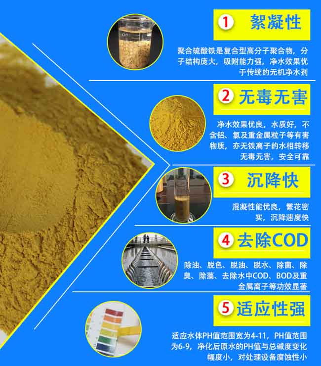 聚合硫酸鐵性能穩(wěn)定,凈水效果優(yōu)良,不含重金屬離子等有害物質(zhì),具有脫色、脫臭、脫油、除菌、脫除水中重金屬離子、放射性物質(zhì)及致癌物等多種功效。對(duì)COD,BOD及色度的去除率高達(dá)90%以上,對(duì)低溫低濁度及高濁度原水凈化效果甚佳。聚合硫酸鐵使用方便,成本低廉,處理費(fèi)用與使用其它無機(jī)絮凝劑相比,一般可節(jié)省20%-50%。使用時(shí)固體聚合硫酸鐵配成10%--30%的水溶液,然后根據(jù)具體情況將配好的溶液按合適的條件和藥量投入,經(jīng)充分?jǐn)嚢韬罂傻玫胶线m的混凝效果。用量可根據(jù)原水的不同渾度,測(cè)定最佳投藥量,一般混濁(濁度在100-500mg/L)水,每千噸使用本品30-50公斤,非飲用水高濁度工業(yè)污水可適當(dāng)投加量 。